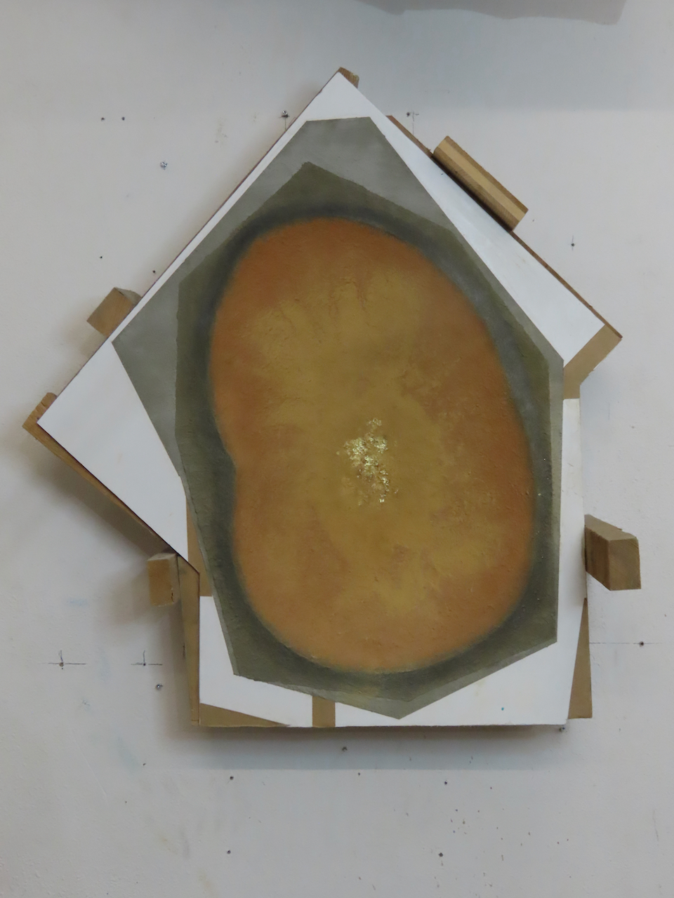 Goldocker (groteske Felsenformation), 2014 Ockergesteine, Karton, Erde, Vegetationsresten, diverse Binder, Pigmente und Farbstoffe, Blattgold / 5 x 5 x 8 cm Privatbesitz